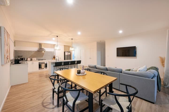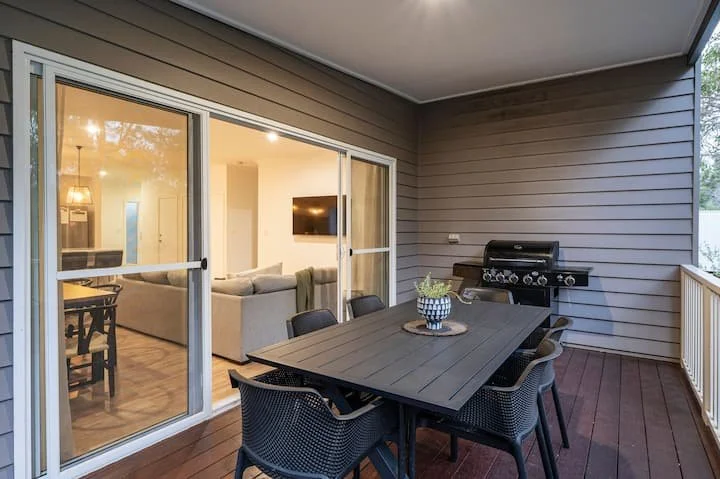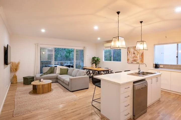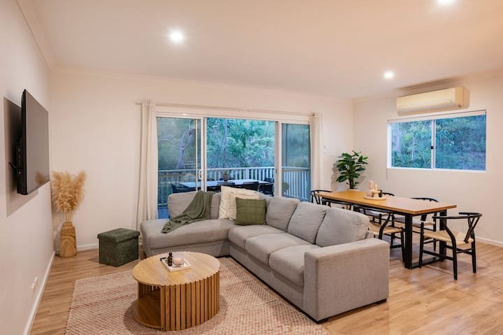 Inside, open-plan living spaces flow seamlessly to a large deck overlooking the bush, ideal for morning coffee, lazy lunches or sunset BBQs. The kitchen is fully equipped for shared meals, and the lounge invites you to relax after a day exploring the region.